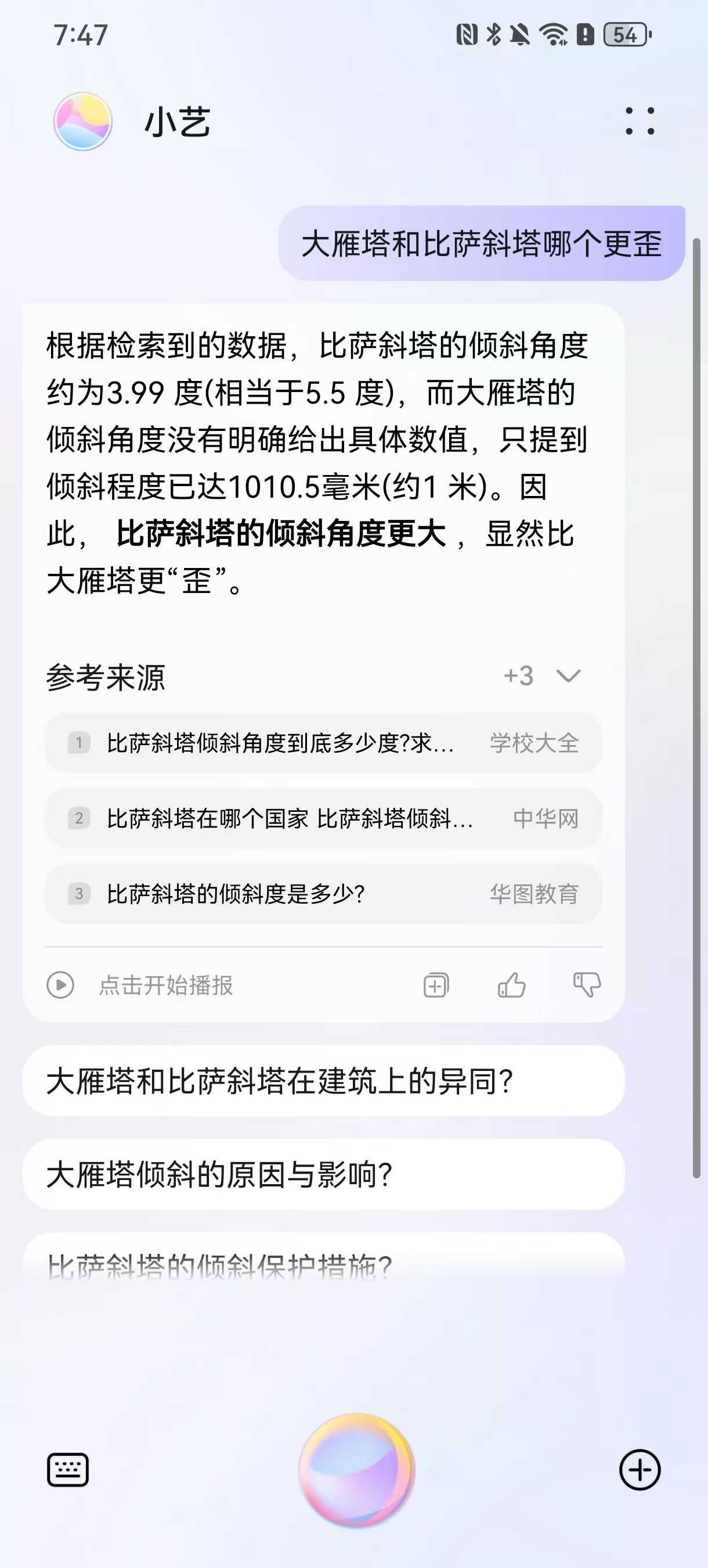 確定好目的地之后,到底怎么玩?對大多數(shù)人來說,既要規(guī)劃詳細(xì)、又要細(xì)節(jié)不出紕漏的“完美旅行攻略”非常費時費力。而小藝可以從特色景點、住宿、餐飲、注意事項等多個維度出發(fā),結(jié)合用戶確定的旅行目的地,為你解答各種旅行知識,堪稱旅行界的百科全書。用戶只需長按華為手機(jī)電源鍵或者對手機(jī)說“小藝小藝”即可喚醒小藝,不論是詢問當(dāng)?shù)氐娜宋闹R、歷史典故,還是推薦熱門景點、美食小吃,小藝都能對答如流,幫助大家更快速了解目的地的相關(guān)信息。比如你可以直接問它“為什么景德鎮(zhèn)的瓷器很出名”、大雁塔和比薩斜塔哪個更歪” “為什么很多人喝不慣北京豆汁兒”,通過各種問題逐漸了解到目的地的各種信息,幫助提升旅行體驗。