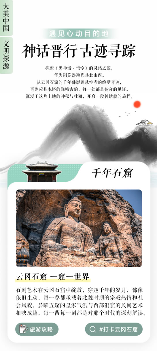 華為瀏覽器的“遇見(jiàn)心動(dòng)目的地”專(zhuān)題還將于9月29日上線大美中國(guó)、文明探源、神話晉行專(zhuān)題,包括大同懸空寺、朔州崇福寺、應(yīng)縣木塔、臨汾鐵佛寺等《黑神話:悟空》游戲中的取景地都會(huì)有相應(yīng)的旅游攻略。專(zhuān)題還會(huì)根據(jù)旅游的目的地和路線的不同,提供多種不同的行程方案,可以根據(jù)自身的實(shí)際情況進(jìn)行挑選,讓我們的旅程變得無(wú)比充實(shí)!
