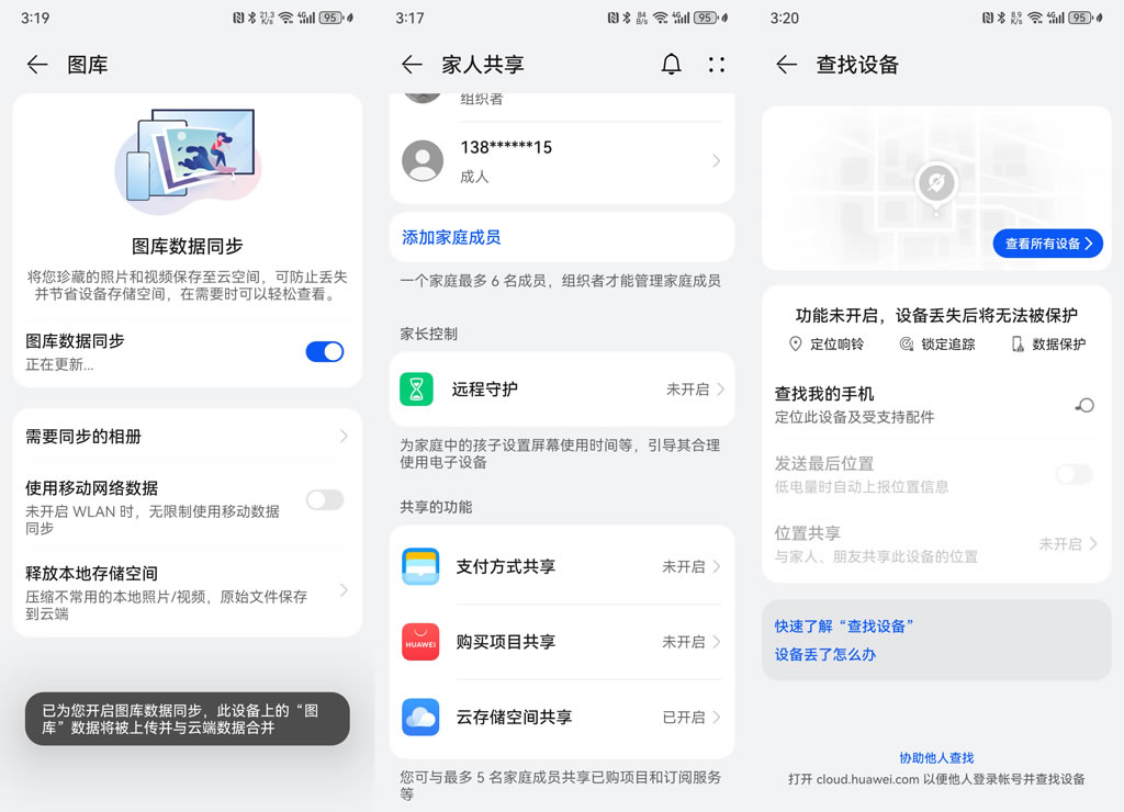 如果實(shí)在找不回手機(jī),也不用擔(dān)心旅途中拍攝的照片和視頻會(huì)丟失。因?yàn)橹灰_(kāi)啟了華為云空間的“圖庫(kù)數(shù)據(jù)同步”功能,手機(jī)里的照片和視頻就會(huì)自動(dòng)上傳到云端,只要通過(guò)華為賬號(hào)就能它們找回來(lái)。