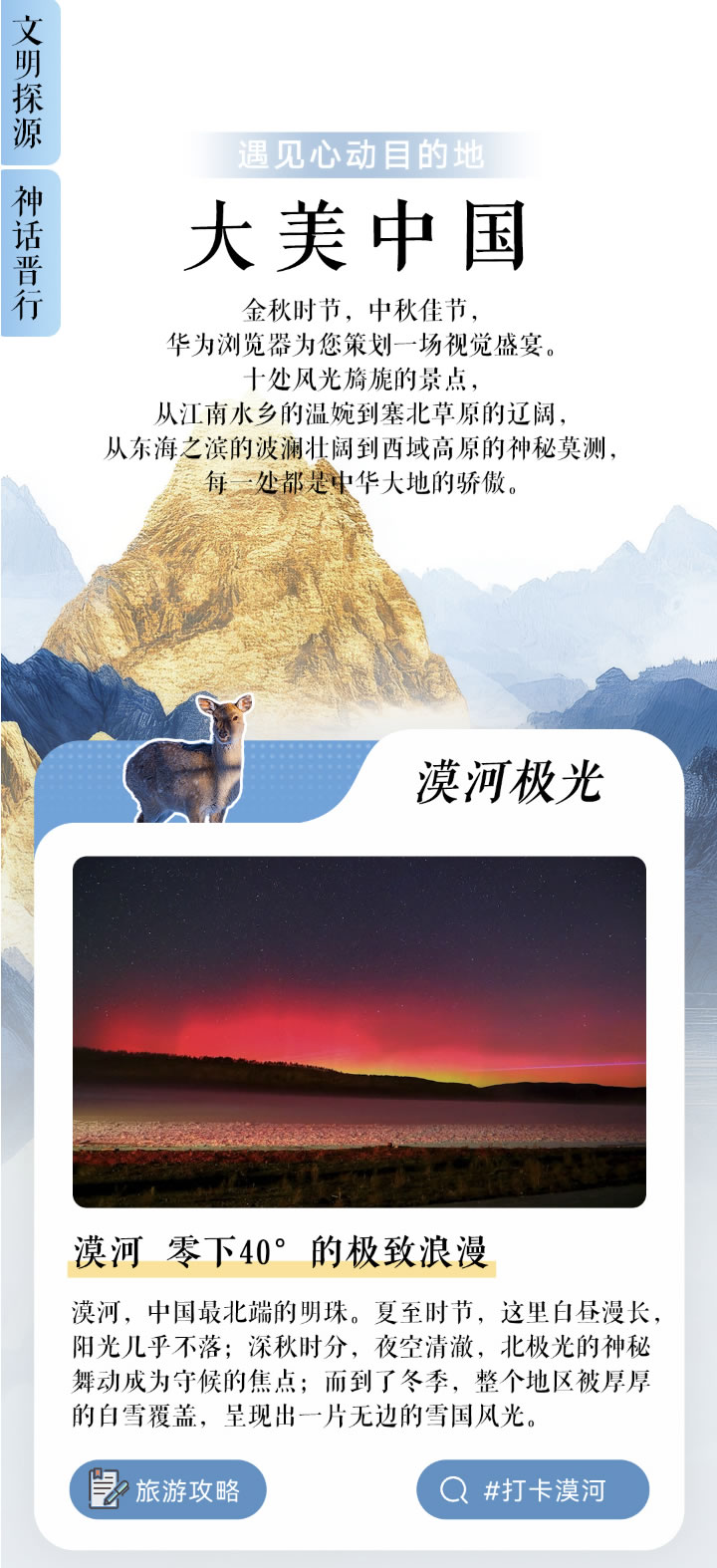 “大美中國(guó)”可以說給熱愛自然風(fēng)光的愛好者帶來(lái)了視覺盛宴。里面精選了十處極具代表性的中華美景,從溫婉細(xì)膩的江南水鄉(xiāng)到遼闊壯麗的塞北草原,從波瀾壯闊的東海之濱到神秘莫測(cè)的西域高原,每一處都是對(duì)中華大地絕美風(fēng)光的極致詮釋。其中,以漠河“零下40°的極致浪漫”為例,無(wú)論是夏日的長(zhǎng)晝、深秋的北極光,還是冬日的雪國(guó)風(fēng)光,都讓人心生向往。用戶不僅可以在專題頁(yè)中詳細(xì)了解每一處景點(diǎn)的獨(dú)特魅力,還能一鍵直達(dá)詳細(xì)旅游攻略,包括大興安嶺自駕環(huán)線等周邊推薦,輕松規(guī)劃出完美的國(guó)慶出游計(jì)劃。