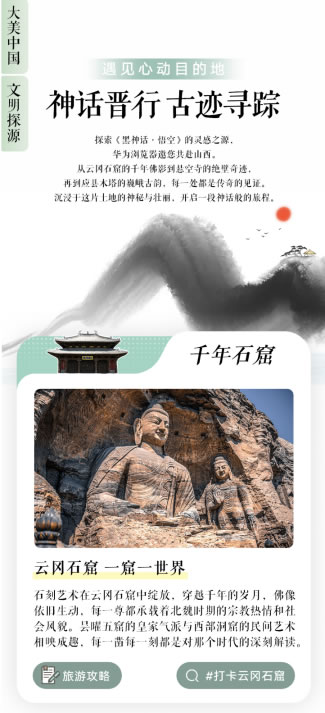 前段時(shí)間大熱的《黑神話·悟空》也讓山西古建進(jìn)入大眾視野,不少游客希望在十一跟隨悟空的步伐,探索打卡這些著名景點(diǎn)。在“神話晉行”板塊可以發(fā)現(xiàn),從云岡石窟的千年佛影到懸空寺的絕壁奇跡,再到應(yīng)縣木塔的巍峨古韻,每一處景點(diǎn)都承載著深厚的歷史文化底蘊(yùn)和傳奇色彩。專題頁(yè)面中這些景點(diǎn)的詳細(xì)信息,包括視頻、圖片、筆記、資訊等多媒體內(nèi)容,以及詳盡的旅游攻略,為一場(chǎng)說走就走的神話之旅做好充分準(zhǔn)備。