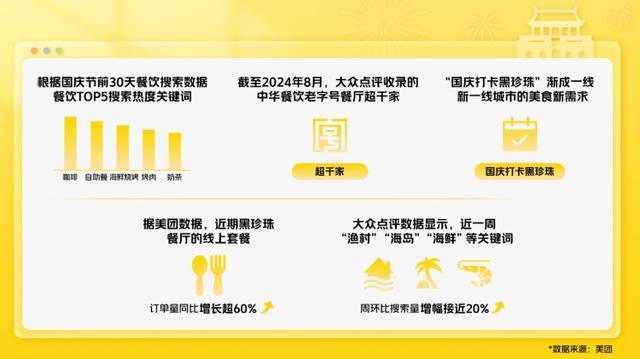 “國慶打卡黑珍珠”漸成一線、新一線城市的美食新需求。據(jù)美團數(shù)據(jù)顯示,近期黑珍珠餐廳的線上套餐訂單量同比增長超60%,深圳、福州、廣州地區(qū)提前一周預訂國慶假期黑珍珠餐廳座位的訂單量同比去年增長均超過2倍,南京、無錫增幅緊隨其后。數(shù)據(jù)顯示,20-30歲的消費者旅行時更喜歡打卡美食市集,為此一些城市還聯(lián)合平臺線上線下打造美食市集等消費新業(yè)態(tài)。