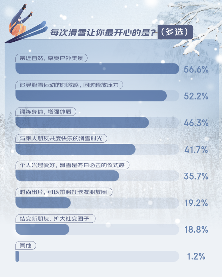 來(lái)自深圳的年輕程序員林小嫻是一名滑雪發(fā)燒友。自前年自己首次嘗試滑雪,便被雪道上飛馳的自由與刺激深深吸引,她感慨地說(shuō):“滑雪讓我重新定義了冬季的樂(lè)趣,每一次滑行都是一次心靈的釋放。”在調(diào)研中,許多人表達(dá)了對(duì)滑雪帶來(lái)的自由、挑戰(zhàn)與樂(lè)趣的深切熱愛,有56.6%的人表示,親近自然、享受美景是他們滑雪時(shí)最開心的時(shí)刻;52.2%的人渴望追尋滑雪運(yùn)動(dòng)的刺激感、釋放壓力;此外,強(qiáng)身健體、與家人朋友共度時(shí)光、結(jié)交新朋友也是滑雪讓人開心的體驗(yàn)。