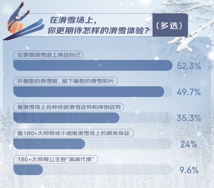 滑雪運(yùn)動(dòng)的持續(xù)“擴(kuò)圈”,也讓滑雪愛好者們對(duì)于滑雪體驗(yàn)的期待日益多元。超半數(shù)人希望在更高級(jí)的雪道上挑戰(zhàn)自我,感受速度與激情的碰撞;有49.7%的人期待穿上最酷的滑雪服,留下最炫的滑雪照片;還有24%的人表示來(lái)雪場(chǎng)期待看到帥哥、美女的颯爽滑雪身姿。