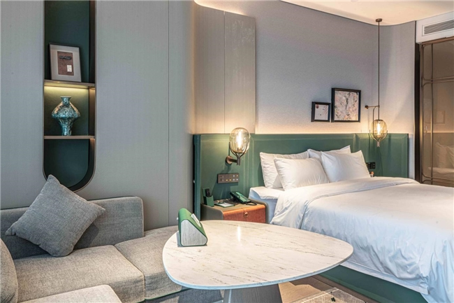 酒店由法國(guó)設(shè)計(jì)師Jave操刀設(shè)計(jì),以"楚韻新譯"為理念,巧妙融合現(xiàn)代奢華元素與荊楚文化傳統(tǒng)特色,打造出既具時(shí)代風(fēng)尚又飽含文化底蘊(yùn)的獨(dú)特空間。大堂主體采用大面積玻璃幕墻,搭配莫蘭迪紅綠配色點(diǎn)綴,白天,陽光透過玻璃傾灑,大堂內(nèi)溫馨明亮,宛如璀璨水晶宮殿;夜晚,借助精妙燈光設(shè)計(jì),呈現(xiàn)出迷人光影效果,成為城市夜色中耀眼的明珠。