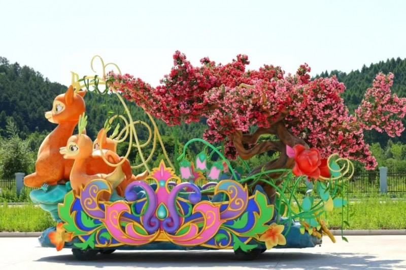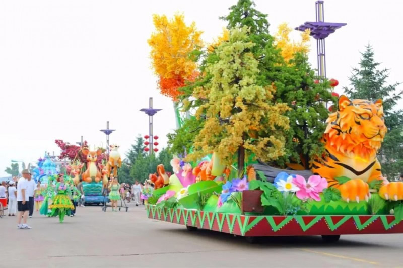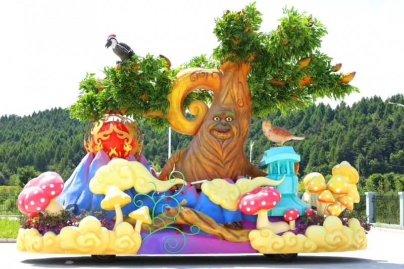 花車設(shè)計(jì)不僅注重視覺沖擊力,更融入動(dòng)態(tài)特效:虎頭擺動(dòng)、翅膀扇動(dòng)、雪花機(jī)噴灑等細(xì)節(jié),讓靜態(tài)的造型煥發(fā)生命力。夜幕降臨時(shí),花車更以夜光效果點(diǎn)亮林海,為觀眾呈現(xiàn)一場光影交織的奇幻盛宴。