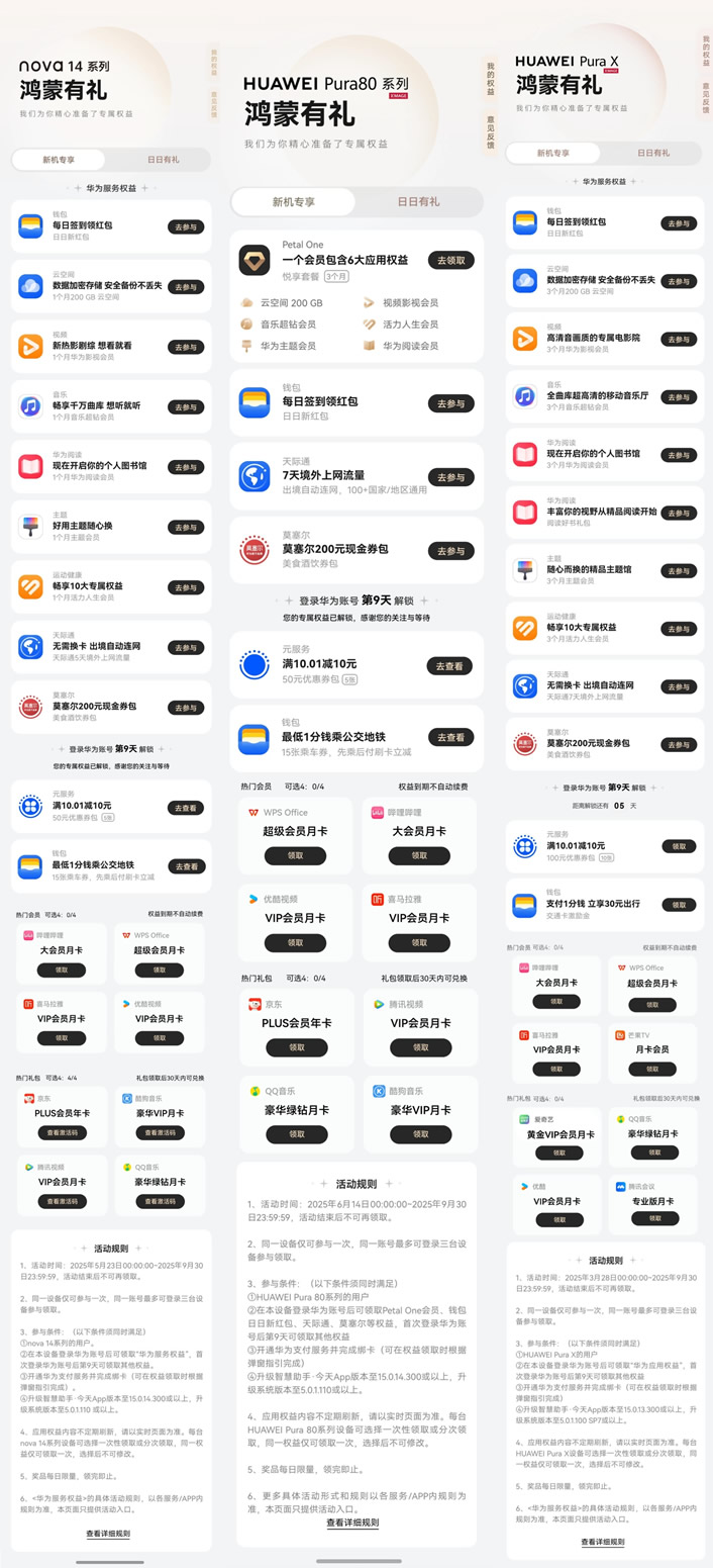 暑期,華為“負(fù)一屏”還上線了“鴻蒙有禮”權(quán)益禮包,覆蓋影視娛樂、旅行交通、外賣餐飲等多重場(chǎng)景,為用戶帶來更便捷、更優(yōu)惠、更智慧的暑期生活服務(wù)。購買Pura X、nova 14系列及Pura 80的新用戶還有額外的“新機(jī)專享”禮包。喚醒小藝說:“幫我領(lǐng)鴻蒙有禮”也能跳轉(zhuǎn)領(lǐng)取。