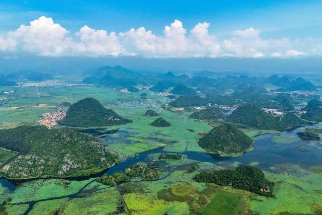 7月16日拍攝的普者黑景區(qū)風(fēng)光(無人機(jī)照片)。新華社記者 彭奕凱 攝
