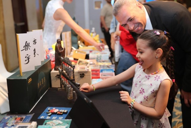 6月12日,一名女孩在埃及開羅舉辦的“茶和天下”尼羅雅集活動現(xiàn)場體驗(yàn)“遇見孔子”非遺文創(chuàng)產(chǎn)品。新華社記者 隋先凱 攝