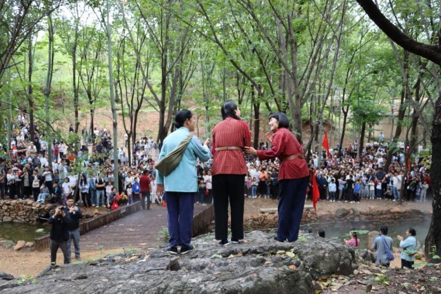 國(guó)慶中秋長(zhǎng)假期間,游客在山東紅嫂家鄉(xiāng)旅游區(qū)觀(guān)看演出。新華社發(fā)