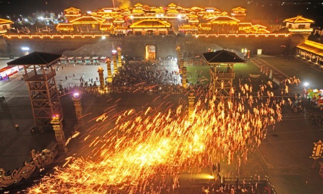 10月3日晚,游客在山東省臨沂市郯城縣郯國(guó)古城景區(qū)觀(guān)看打鐵花。新華社發(fā)(張春雷攝)