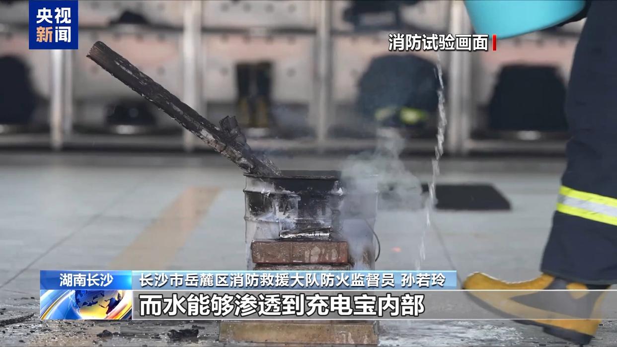 長沙市岳麓區(qū)消防救援大隊(duì)防火監(jiān)督員 孫若玲:干粉滅火器的滲透性和降溫效果比較差,在應(yīng)對充電寶著火時(shí)效果并不理想,而水能夠滲透到充電寶內(nèi)部,有效滅火并起到降溫作用。