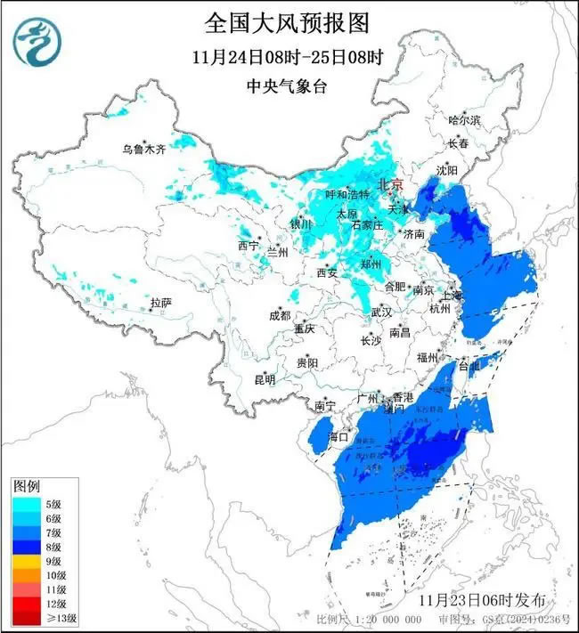 11月24日08時至25日08時,內(nèi)蒙古中西部、甘肅北部、青海東北部、西北地區(qū)東部、華北等地的部分地區(qū)有5~7級大風,陣風8~9級,黃淮北部和西部、江漢等地的部分地區(qū)有5~6級大風,局部地區(qū)陣風7~8級;渤海、黃海中部和南部局地、南海北部和中部海域將有7~8級、陣風9~10級的大風。