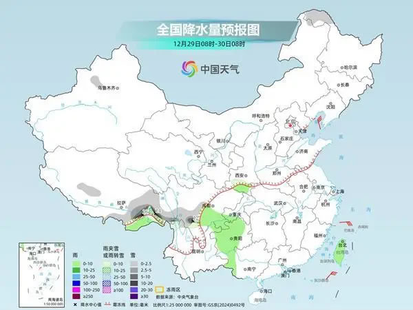 預(yù)計(jì)30日夜間開始,隨著暖濕氣流增強(qiáng),西藏東部、四川、貴州、重慶、陜西南部、湖北西部等地降水又會(huì)發(fā)展增多。之后,水汽繼續(xù)向東、向北輸送,黃河以南地區(qū)將出現(xiàn)一輪“跨年”降水。目前來看這輪降水范圍廣,但強(qiáng)度不大,多是小到中雨雪量級(jí)。公眾需密切關(guān)注臨近預(yù)報(bào),做好相關(guān)防范措施。