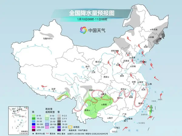 這次冷空氣南下過(guò)程中,帶來(lái)的雨雪天氣并不多,主要在內(nèi)蒙古中東部、東北一帶。監(jiān)測(cè)顯示,9日8時(shí)至10日6時(shí),內(nèi)蒙古中東部、遼寧、吉林、黑龍江東部、河北北部、山西北部等地出現(xiàn)小到中雪或雨夾雪,內(nèi)蒙古東南部、遼寧中東部、吉林東南部部分地區(qū)現(xiàn)大到暴雪。