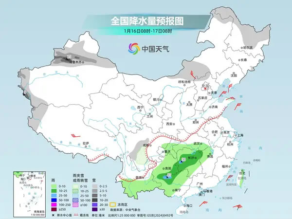 明天,新疆北部和南疆西部山區(qū)、內蒙古中部、黑龍江中北部、川西高原北部等地部分地區(qū)有小到中雪或雨夾雪,其中,伊犁河谷山區(qū)和南疆西部山區(qū)等地部分地區(qū)有大到暴雪;湖北南部、江南中西部、重慶中部、貴州、云南中南部、廣西中西部等地部分地區(qū)有小到中雨,局地有大雨。