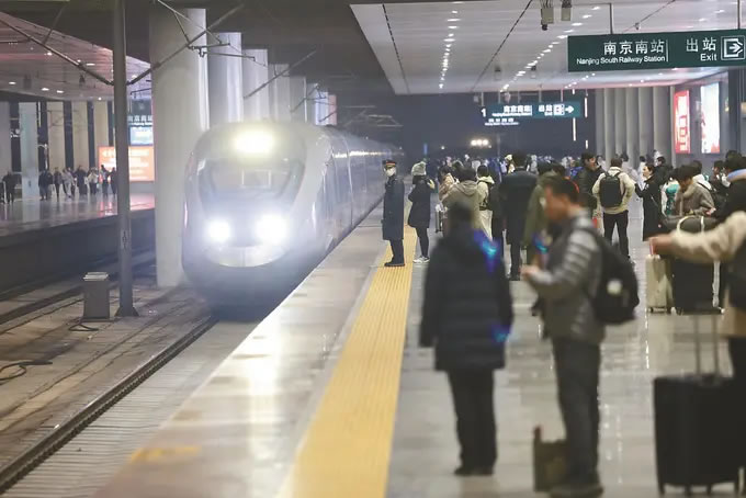從1月26日零時起,全國鐵路實行新的列車運行圖,調圖后,圖定旅客列車較原圖增加243列。京滬高鐵標桿列車G25次迎來了“瘦身”升級:這趟京滬間最快高鐵取消原有5個停靠站,僅設南京南站唯一經停點。圖為當日晚,旅客在南京南站準備乘坐G25次列車。(陳儼 攝)