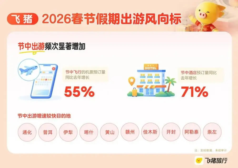 游客節(jié)中最愛去哪里?據(jù)飛豬觀察,長線的“3小時(shí)飛行圈”和短線的“2小時(shí)自駕圈”特征明顯,前者集中于一二線城市周邊300公里內(nèi)的寶藏小城,后者集中于西南、西北、東北等典型的旅游城市。從目的地來看,通化、普洱、伊犁、喀什、黃山、贛州、佳木斯、開封、阿勒泰、崇左等城市的節(jié)中出游預(yù)訂增速較快。