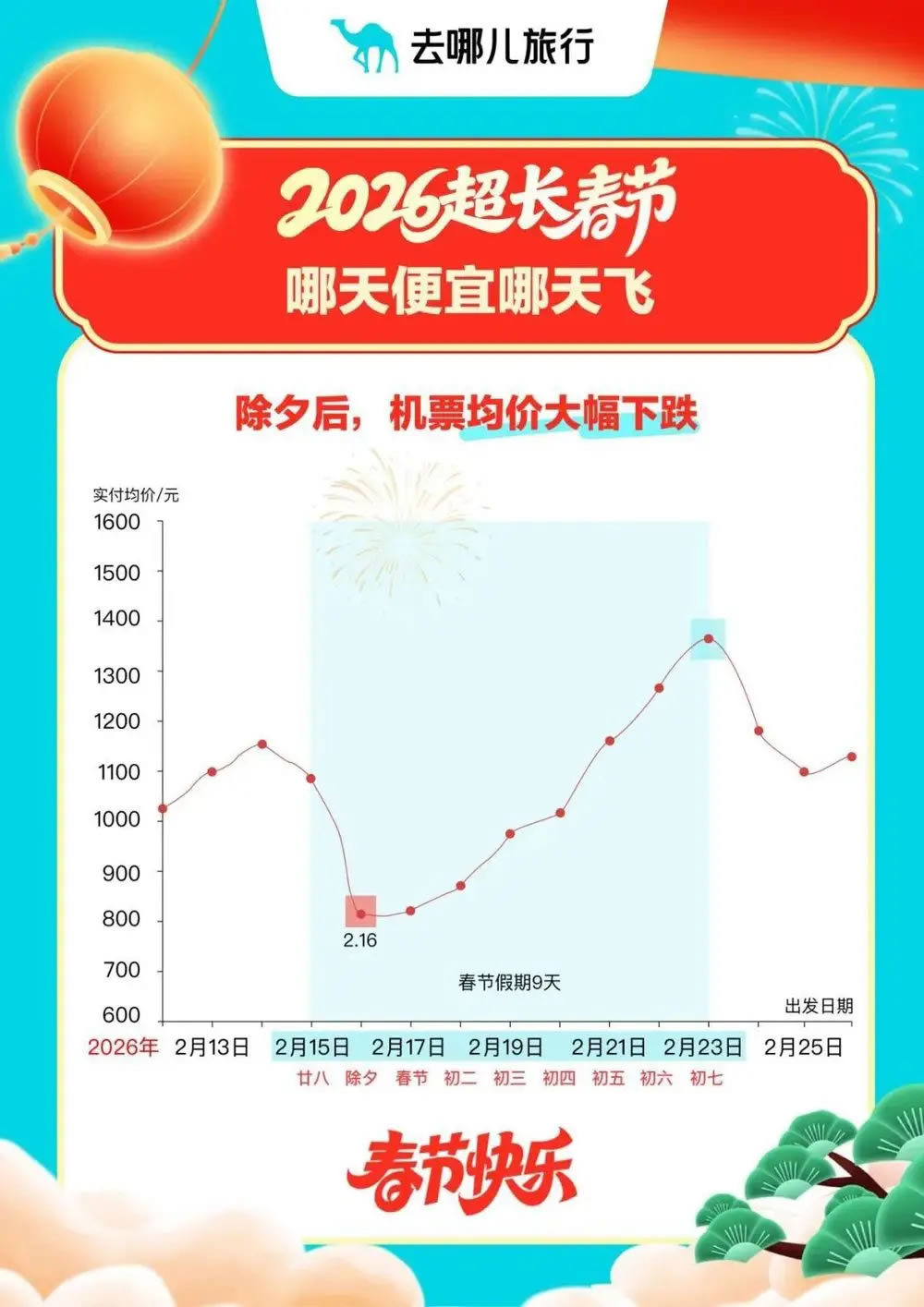 另據(jù)去哪兒旅行大數(shù)據(jù),進(jìn)入2月9日(農(nóng)歷臘月二十二)節(jié)前一周,預(yù)訂機(jī)票出行的旅客量就開始逐日增加,到2月14日(二十七)達(dá)到節(jié)前高峰。機(jī)票價(jià)格則跟出行量成正比,到2月15日(二十八)春節(jié)假期第一天,機(jī)票價(jià)格開始回落,2月16日(二十九,即除夕)降至節(jié)日期間最低點(diǎn),17日-19日機(jī)票價(jià)格都相對劃算。