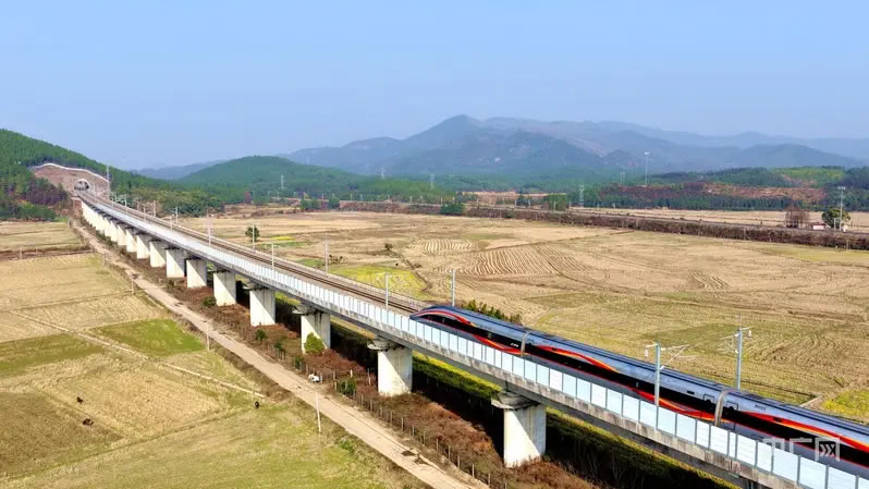 列車穿梭于田野山巒之間,構(gòu)成一幅生動的高鐵春運圖景 (央廣網(wǎng)發(fā) 宋靖輝 攝)