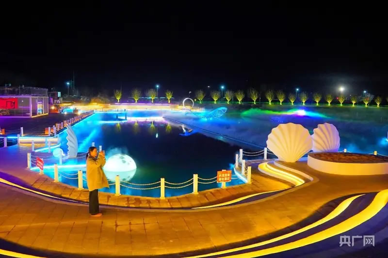 記者在現(xiàn)場看到,技術(shù)人員正緊張調(diào)試投影設(shè)備,水幕自湖面徐徐升起,畫面仿佛從水中“生長”而出。春節(jié)期間,整片尖山湖將化身天然巨幕,沉浸式水幕電影每晚準(zhǔn)時上演,激光、水霧、音效完美交融,帶來震撼視聽體驗。