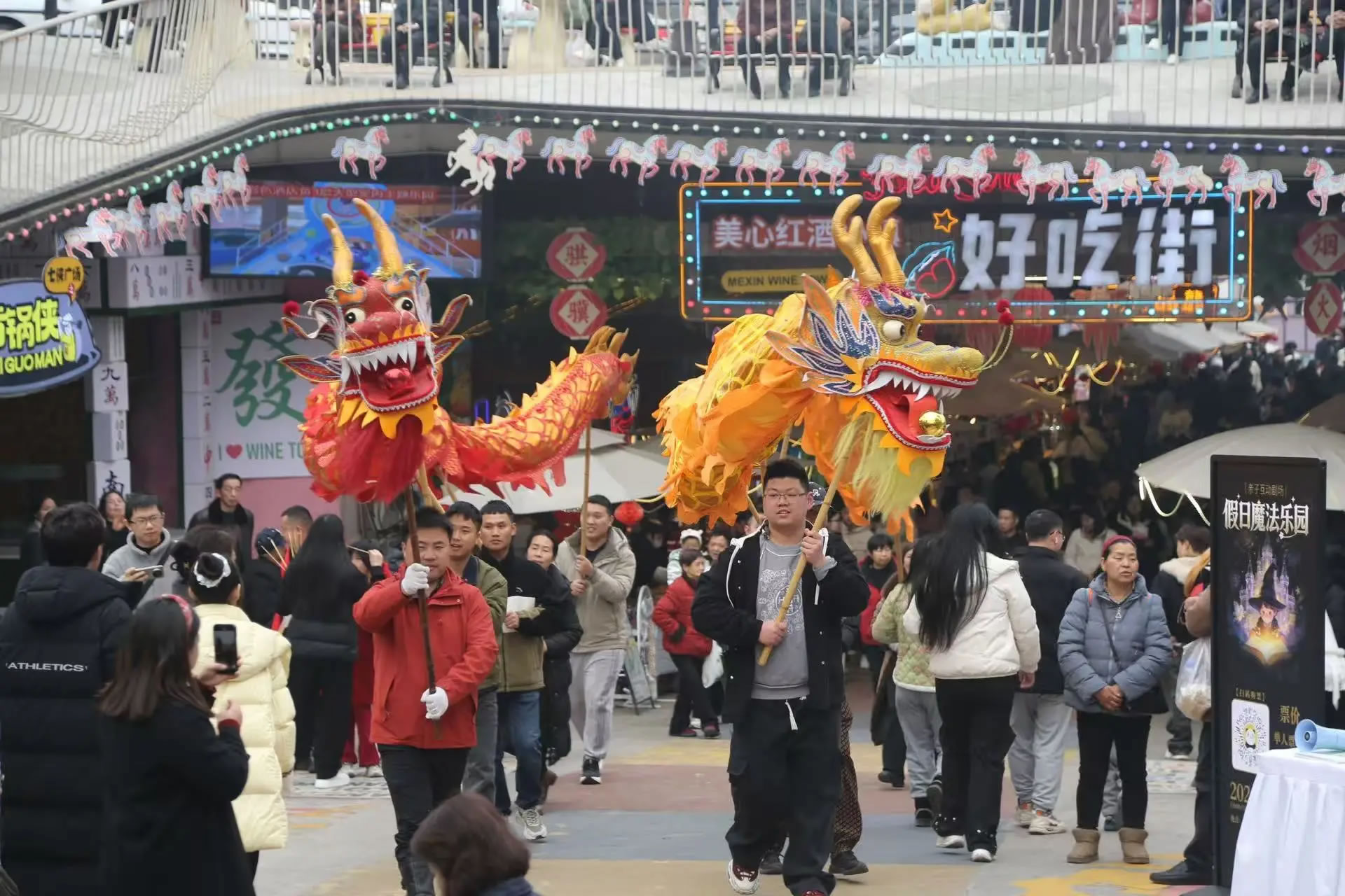 涪陵美心紅酒小鎮(zhèn)景區(qū)更是打破傳統(tǒng)景區(qū)“臺上表演、臺下觀看”的模式,全面轉向以游客為主導,全民參與、沉浸式互動的新春玩法,把游客真正“寵”進濃濃年味里。除了舞龍舞獅、民俗巡游、財神送福等經(jīng)典項目外,游客還可以穿戲服、持龍具、跟著鼓點一起巡游,親身感受傳統(tǒng)年俗的熱鬧與儀式感,從“圍觀者”變身“參與者”,讓年味更足、歡樂加倍。15日至17日,景區(qū)人氣持續(xù)火爆,日均接待游客超6萬人次,成為重慶近郊新春出游的熱門之選。