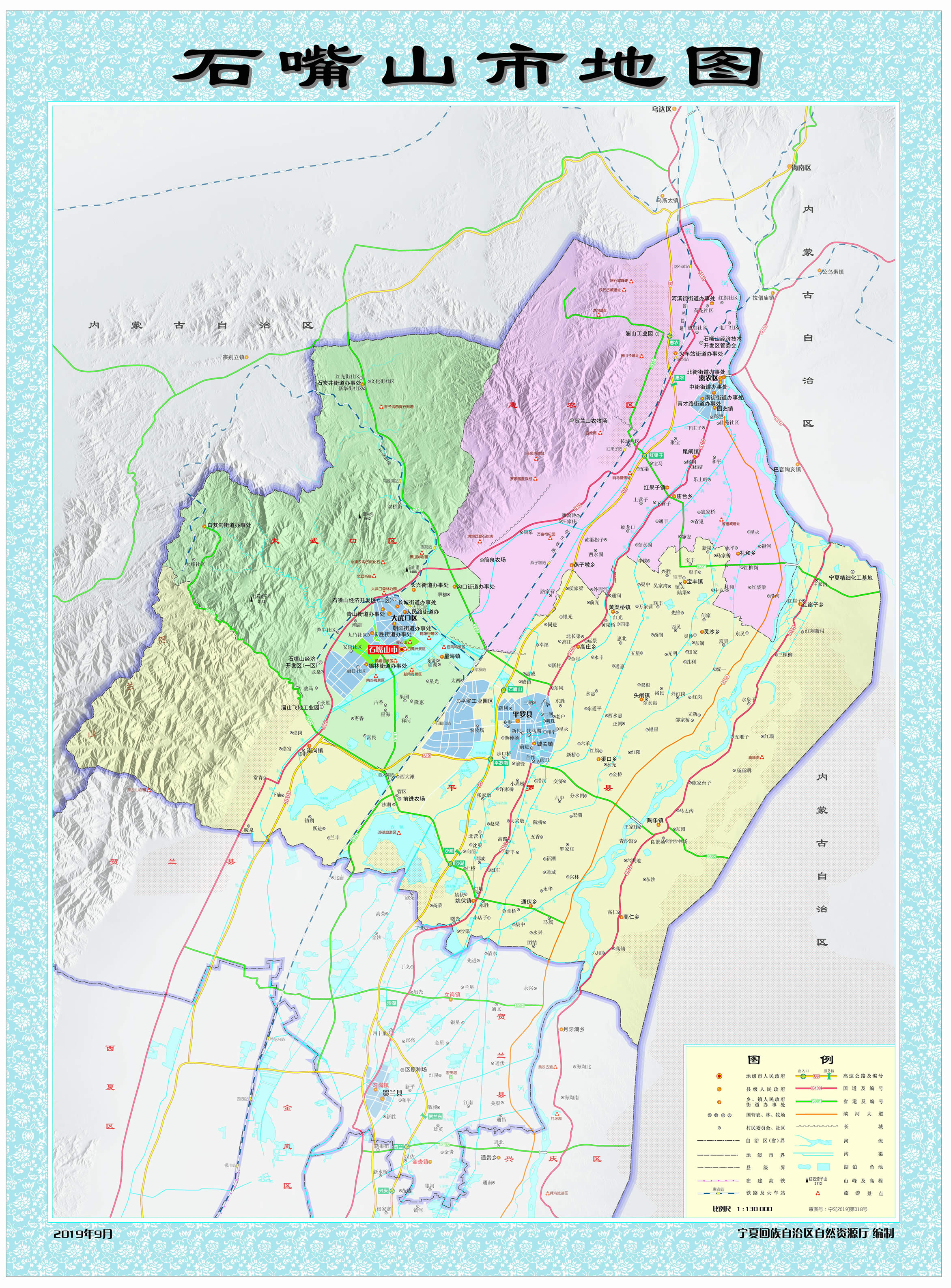 1975年11月23日,撤銷銀北地區(qū),恢復(fù)石嘴山市。石嘴山市因賀蘭山與黃河交匯處“山石突出如嘴”而得名,歷史悠久,秦朝時設(shè)渾懷障,西漢時設(shè)置第一個行政建制——廉縣,悠久歷史造就了厚重的文化底蘊,孕育了賀蘭山巖畫、古長城、北武當壽佛寺、平羅玉皇閣、田州塔等人文古跡,擁有移民文化、賀蘭山文化、工業(yè)文化等民宿文化;地理位置較為優(yōu)越,地處寧東、蒙西兩個國家千億噸級煤田之間,是呼包銀蘭經(jīng)濟帶、寧夏沿黃經(jīng)濟區(qū)、寧蒙陜?yōu)踅鹑墙?jīng)濟區(qū)的重要節(jié)點城市;距銀川河?xùn)|機場100千米,包蘭鐵路、京藏高速、烏瑪高速、109國道、110國道等貫穿全境,被列為國家公路運輸樞紐城市、區(qū)域流通節(jié)點城市之一;黃河穿東過,西依賀蘭山,湖泊星羅棋布。市境內(nèi)有5A級旅游景區(qū)沙湖、國家水利風(fēng)景區(qū)星海湖等風(fēng)景名勝。