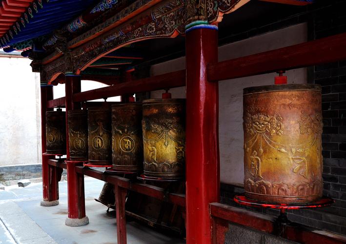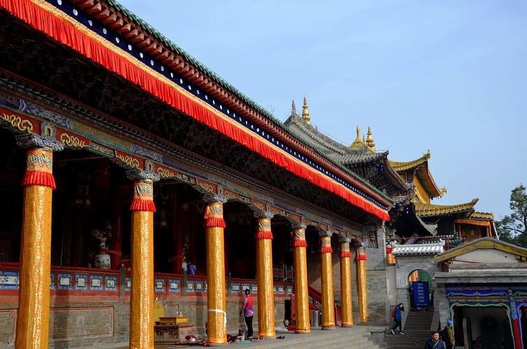 又稱文殊菩薩殿,為漢式硬山頂建筑,面闊九間,進(jìn)深三間,面積592平方米。初建于明萬(wàn)歷二十年(公元1592年),清雍正十二年(公元1734年)擴(kuò)建。廊柱為藏式朱色八楞柱。整座大殿以三間為一單元,由北向南分別為獅子吼佛殿、文殊殿和宗喀巴殿。花寺又稱祈壽殿,建于清康熙五十六年(公元1717年),系一獨(dú)立的小庭院,殿為兩層重檐歇山頂建筑。柱頭梁枋都飾以飛禽、走獸、花卉、文紋,院墻飾琉璃磚雕。殿內(nèi)供奉釋迦牟尼、十六羅漢和四大金剛等塑像。