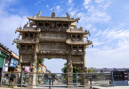 是典型清代石雕建筑,俗稱張家牌坊,被譽(yù)為“天下第一坊”,位于牌坊街中段。因其夾柱精雕一百個姿態(tài)各異的石獅子而得名,寓有“百事(獅)如意,百世(獅)多壽(獸)”之意。乃清乾隆四十三年(1778年)為贈文林郎張蒲妻朱氏而建,全石結(jié)構(gòu),高14米,寬9米,四柱三間五樓式,正間單檐,次間正檐,歇山頂,全部石砌。坊座八根夾柱透雕群獅八組,大獅子獰猛崢嶸,小獅子環(huán)繞戲耍。每根夾柱前、左、右三面均浮雕松獅圖。四柱和枋額上透雕云龍,其它部位也透雕加浮雕云龍旋舞,珍禽異獸、花卉圖案。