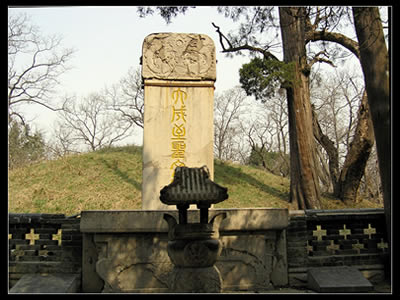 享殿之后是孔林的中心所在--孔子墓。此墓似一隆起的馬背,稱馬鬣封。墓周環(huán)以紅色垣墻,周長(zhǎng)里許。墓前有巨墓篆刻“大成至圣文宣王墓”,是明正統(tǒng)八年(公元1443年)黃養(yǎng)正書(shū)。墓前的石臺(tái),初為漢修,唐時(shí)改為泰山運(yùn)來(lái)的封禪石筑砌,清