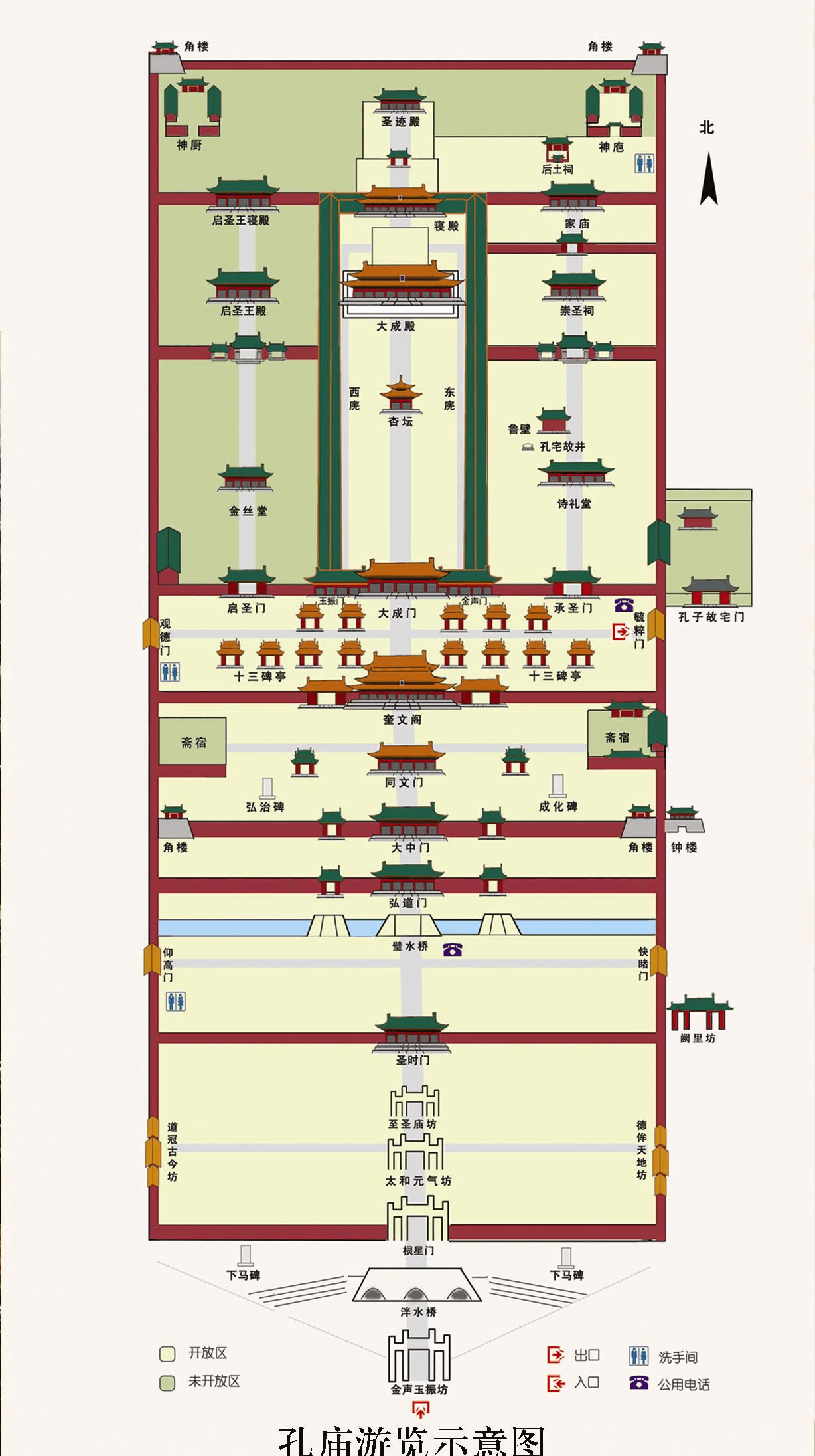 橋南東西二門,甬道相連,東匾“快睹門”,取李渤“如景星鳳凰,爭先睹之”語,即“先睹為快”之意;西匾“仰高門”取自《論語》“仰之彌高”語,贊頌孔子學問十分高深。此是孔廟的第二道偏門。過去只有皇帝祭祀才可走正門,一般人只駔從仰高門進廟。