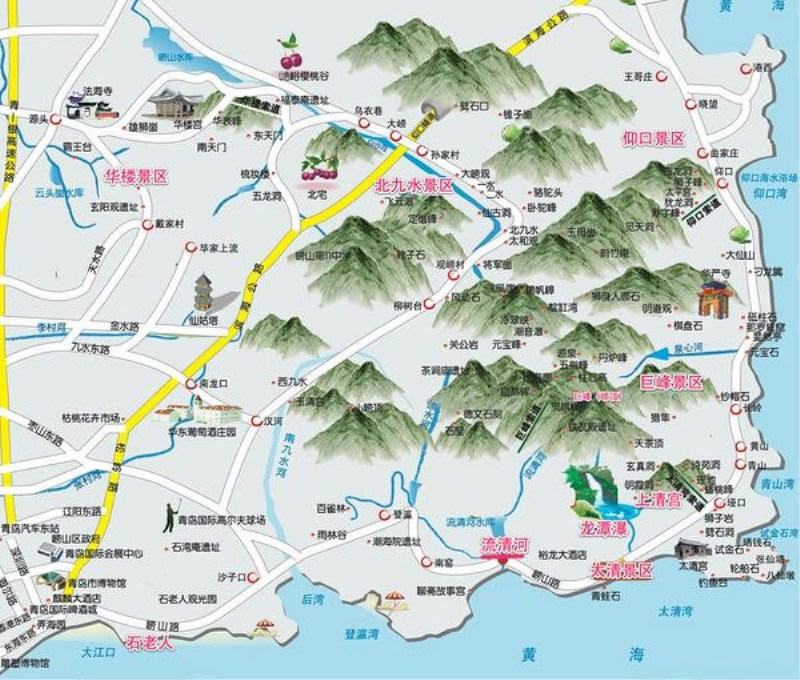 3、中線:也是由李滄區(qū)李村出發(fā),向東經北龍口轉北,經北宅,烏衣巷赴北九水景區(qū)。若時間允許,此線可于途中游覽華樓景區(qū);亦可驅車經柳樹臺攀巨峰,步行過潮音瀑亦可達巨峰。由大嶗觀可轉赴仰口景區(qū)。