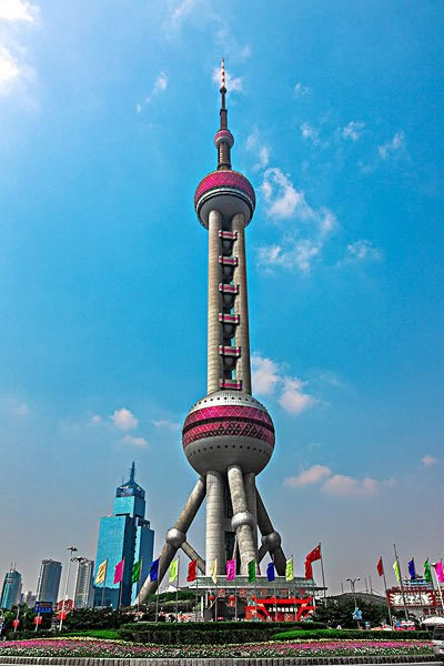 東方明珠觀廣播電視塔選用東方民族喜愛的圓體作為基本建筑線條,具有鮮明的海派建筑特色,使現(xiàn)代科技與東方文化結(jié)合統(tǒng)一;建造過程中創(chuàng)造性的使用了許多施工新工藝,如地下20米深基礎(chǔ)施工、350米高直筒體施工、93米高的斜筒體施工、豎向307米長預應力鋼絞線張拉、350米混凝土泵送、塔身垂直度偏差控制、高垂直運輸起重、鋼結(jié)構(gòu)球體吊裝施工和450噸鋼桅桿天線就位安裝等。