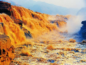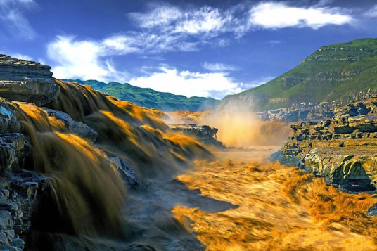在高處河岸上,幾乎是看不到“龍槽”和黃河水流,只能看到紫褐色基巖河床中一線急騰翻卷的黃濁水塵和聽(tīng)到轟鳴不息的奔騰濤聲。這槽中激流就象一鍋滾沸的水,左奔右?jiàn)Z,奔騰翻滾急下,激起的水霧彌漫在龍槽之上,使黃河在這里變得朦朦朧朧。每逢汛期黃河水漲時(shí),洪水溢出壺口龍槽一端,龍槽東岸會(huì)出現(xiàn)一道一、二千米長(zhǎng)的漫流水簾,十分壯觀。遠(yuǎn)望龍槽,彎彎曲曲的峽中石槽,活象一條搖頭擺尾的巨龍,壺口是龍頭,一口吞沒(méi)黃河巨流。孟門是龍尾,腹泄河水于下游。
