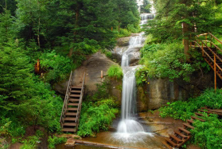 九重瀑布位于寧武縣東寨鎮(zhèn)大溝村腳下,在情人谷景點與馬侖草原之間,距東寨鎮(zhèn)約12公里。因其地勢高峻,天藍氣清,有似入天宇之感,故名“九重瀑布”。瀑布從森林密布的山谷石崖上直瀉而下,全場300余米,落差高達55米,流量120m/s,負氧離子28000個/cm,暑期最高氣溫19°C。