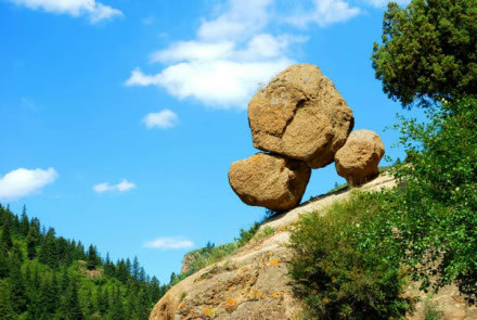 寧武縣城30公里處的東寨鎮(zhèn)西樓子山南麓半坡,有一座峭巖矗立于溝側(cè)溪畔。這峭巖高約兩丈余,頂部巍巍托起一塊巨大奇石。這奇石以兩塊小石作支腳,立于約三四十度的峭巖斜坡頂部。奇石高約3米,闊約2米。雖立斜坡,風(fēng)吹似動,但數(shù)干百年來,它卻一直屹立在那里。由于奇石狀似加蓋的鍋,支撐它的兩小石形若鍋腳,故而人稱“支鍋奇石”,成為古寧武府和寧武縣八大奇景之一。據(jù)關(guān)專家考察,該奇石形成于第四紀冰川期。