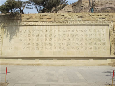 位于云岡石窟一窟山門(mén)前的“比丘尼曇媚造像記”石刻,為公元503年(景明四年)的題記。此碑刻有文字110個(gè),再現(xiàn)了當(dāng)時(shí)的社會(huì)背景,表達(dá)了發(fā)愿人比丘尼曇媚對(duì)佛教的高度信仰與虔誠(chéng)以及希望佛教振興發(fā)展的愿望,文筆優(yōu)美,堪稱佛教發(fā)愿文之最。此碑也向我們展示了北魏時(shí)期一種特有的字體。因這種字體在當(dāng)時(shí)多用于碑文,所以后人稱它為魏碑體。魏碑字體外方內(nèi)圓、拙樸有力,是隸書(shū)向楷書(shū)過(guò)渡的字體。由此看來(lái),魏碑書(shū)法應(yīng)是北魏平城時(shí)的創(chuàng)造。原物很小,只有30厘米高,28厘米寬,于1956年20窟前考古發(fā)掘,現(xiàn)存于云岡博物館中。