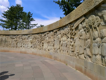 穿過(guò)神柱林立的佛光大道向西,呈現(xiàn)于世人眼前的是兩面相對(duì)的扇形皇家禮佛浮雕墻。這組正面相對(duì)的浮雕墻總體呈圓弧狀,長(zhǎng)約20米、高約4米,畫(huà)面構(gòu)圖完美,雕刻細(xì)致,以高浮雕的形式,生動(dòng)表現(xiàn)了北魏皇家盛大的帝后禮佛圖。車(chē)轔轔、馬蕭蕭的現(xiàn)場(chǎng)氣氛,充分再現(xiàn)了北魏當(dāng)時(shí)皇帝、皇后前往禮佛的莊嚴(yán)肅穆的宏大場(chǎng)面,這種場(chǎng)面讓人自然聯(lián)想到1500多年前云岡石窟作為皇家寺院曾經(jīng)的輝煌,讓人舉目流連。