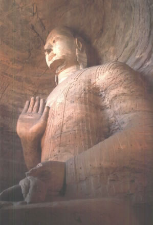 早期石窟:即今第16~20窟,亦稱為曇曜五窟。根據(jù)《魏書(shū)·釋老志》(卷114)記載:“和平初,師賢卒。曇耀代之,更名沙門(mén)統(tǒng)。初,曇耀于復(fù)法之明年,自中山被命赴京,值帝出,見(jiàn)于路,御馬前銜耀衣,時(shí)人以為馬識(shí)善人,帝后奉以師禮。曇曜白帝,於京城西武州塞,鑿山石壁,開(kāi)窟五所,鐫建佛像各一,高者七十尺,次六十尺,雕飾奇?zhèn)ィ谟谝皇!蔽闹杏浭龅拈_(kāi)窟五所,就是當(dāng)時(shí)著名的高僧曇曜就選擇了鐘靈毓秀的武州山,開(kāi)鑿了雄偉壯觀的曇曜五窟,揭開(kāi)了云岡石窟開(kāi)鑿的序幕。第16~20窟即帝王象征的曇曜五窟,以造像的風(fēng)格和創(chuàng)作的技法來(lái)看,是云岡全窟群中最早的五個(gè)窟。平面為馬蹄形,穹隆頂,外壁滿雕千佛。主要造像為三世佛(過(guò)去、現(xiàn)在、未來(lái)),佛像高大,面相豐圓,高鼻深目,雙肩齊挺,顯示出一種勁健、渾厚、質(zhì)樸的造像作風(fēng)。其雕刻技藝?yán)^承并發(fā)展了漢代的優(yōu)秀傳統(tǒng),吸收并融合了古印度犍陀羅、秣菟羅藝術(shù)的精華,創(chuàng)造出具有獨(dú)特的藝術(shù)風(fēng)格,這是中外融合所形成的新的藝術(shù)風(fēng)格。