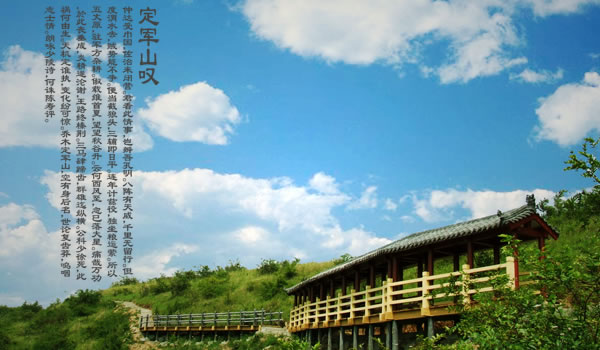 定軍山:定軍山位于陜西省漢中市勉縣城南5千米,三國時(shí)期古戰(zhàn)場(chǎng)。為省級(jí)風(fēng)景名勝區(qū)。原屬武侯墓鄉(xiāng),今屬定軍山鎮(zhèn)轄區(qū)。三國時(shí),蜀將黃忠斬夏侯淵、趙顒?dòng)诖耍跉v史上遂負(fù)盛名。屬大巴山脈,其脈自高廟子入平地,隆起秀峰12座,自石山子至元山子,號(hào)稱“十二連峰”,再東為當(dāng)口寺孤峰,自西向東綿延十多公里,如游龍戲珠,故有“十二連山一顆珠”之譽(yù)。主峰定軍山為最高處,海拔833米,山頂原有“古定軍山”石碑,文革被毀,今新立。山南有一個(gè)天然鍋底形的大洼,周長(zhǎng)1.5千米,即三國時(shí)稱為“可屯萬兵”的“仰天洼”。北麓有一片廣漠沃野,就是當(dāng)年諸葛亮大布“八陣圖”、設(shè)“督軍壇”的武侯坪,黃忠大戰(zhàn)夏侯淵的戰(zhàn)場(chǎng),時(shí)常發(fā)現(xiàn)“扎馬釘”和箭鏃,傳為蜀軍用兵之物;山旁有“斬將橋”,“八角琉璃井”井口八角形,薄頁細(xì)花紋漢磚砌成,皆不存。山半腰有一大石,高約3.3米,寬約2米,中開一縫,寬窄不一,名曰“擋箭牌”,傳為諸葛亮遮擋敵箭的遺物。
