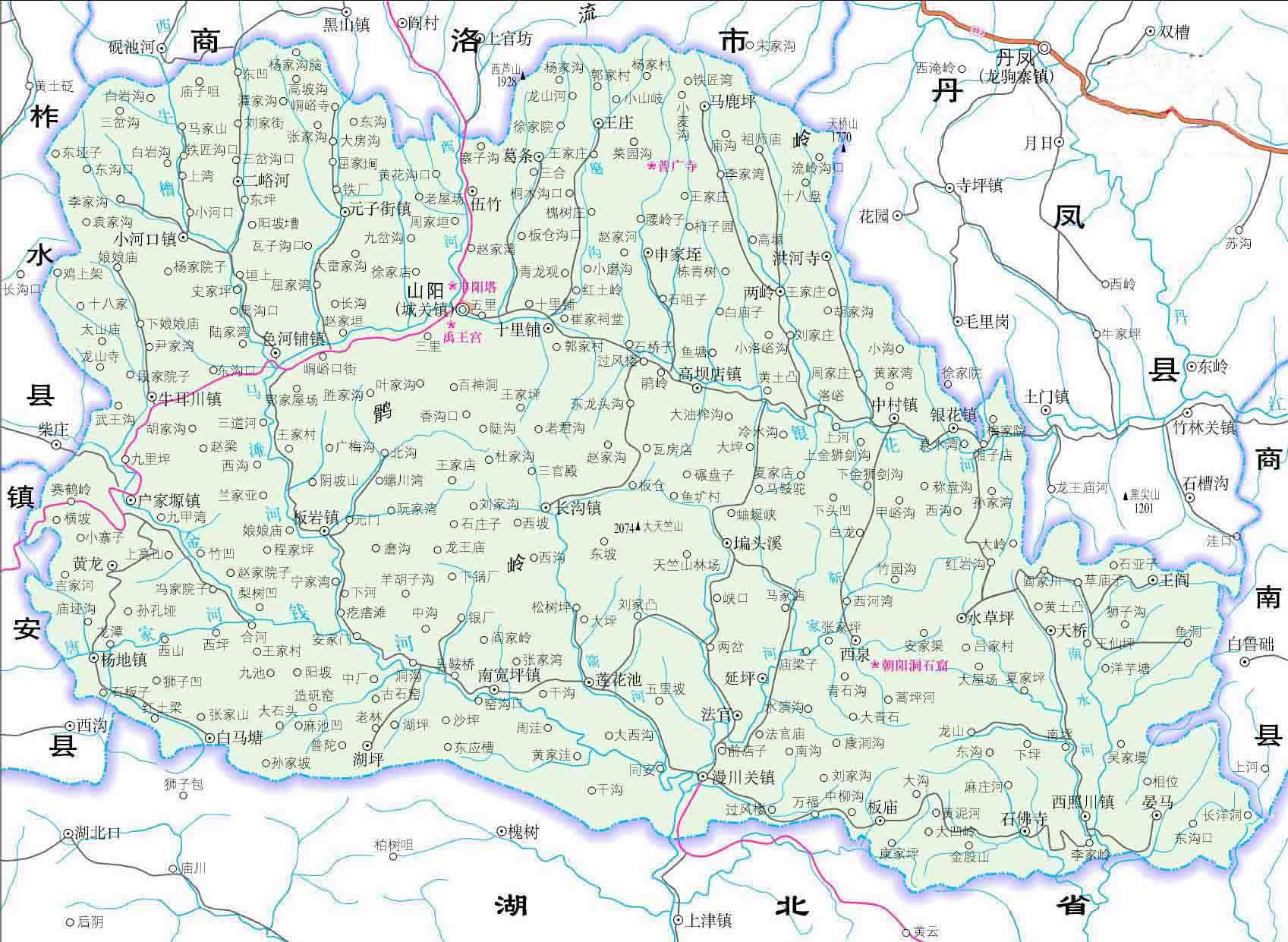 鎮(zhèn):城關(guān)鎮(zhèn)、高壩鎮(zhèn)、長(zhǎng)溝鎮(zhèn)、中村鎮(zhèn)、銀花鎮(zhèn)、西照川鎮(zhèn) 、漫川關(guān)鎮(zhèn)、南寬坪鎮(zhèn)、戶家垣鎮(zhèn)、楊地鎮(zhèn)、牛耳川鎮(zhèn)、小河口鎮(zhèn)、色河鋪鎮(zhèn)、板巖鎮(zhèn)、元子街鎮(zhèn)