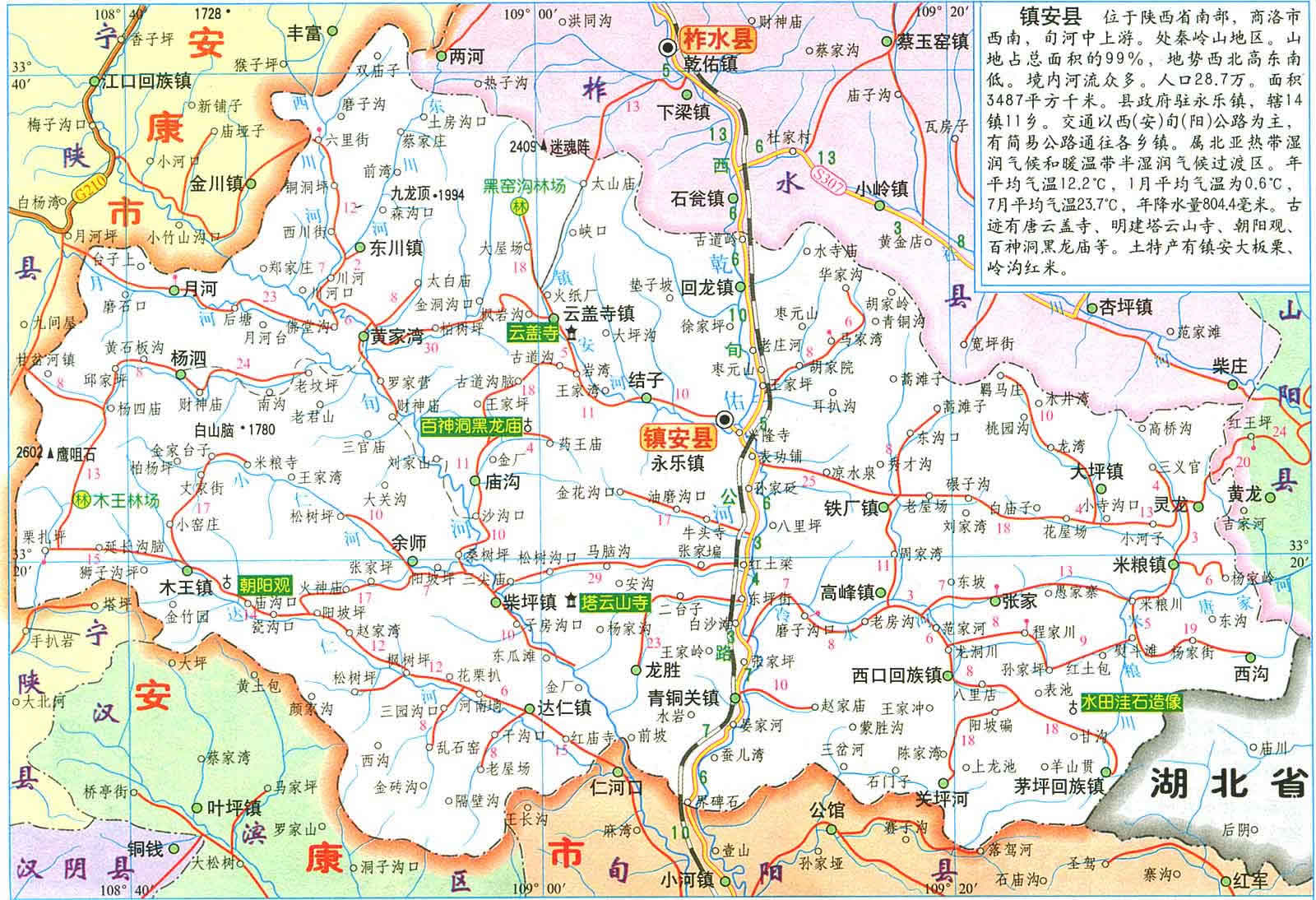 鎮(zhèn)安縣位于秦嶺東段南麓, 位于北緯33.8'至33.48"57',東經(jīng)108 34"35'至109 36"51'。距陜西省西安市195公里,離商洛市178公里。面積3487平方公里。縣委、縣政府駐地永樂(lè)鎮(zhèn)(謝家彎)縣城前街188號(hào)。境內(nèi)最高點(diǎn)為楊泅鄉(xiāng)鷹嘴石,海撥2601.6米,最低點(diǎn)是龍勝鄉(xiāng)詢河村河谷,海撥344米,高低落差2257.6米,地勢(shì)西北向東南傾斜;屬長(zhǎng)江水系漢江支流;年均降雨量804.4毫米,年平均氣溫12.2℃,屬亞熱帶半濕潤(rùn)氣候。