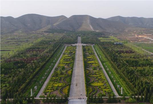 橋陵陵園略呈長方形,東西長2871米,南北長2836米,總面積852萬平方米。四面開辟有門,四角有樓。歷經千年風蝕雨剝,唐橋陵所保留的石華表、石鴕鳥、石馬、石人、石獨角獸、石獅等五十余尊巨大石刻依然形態(tài)清晰,生動自然,其中的38尊排列在寬達110米、長625米的神道兩旁。