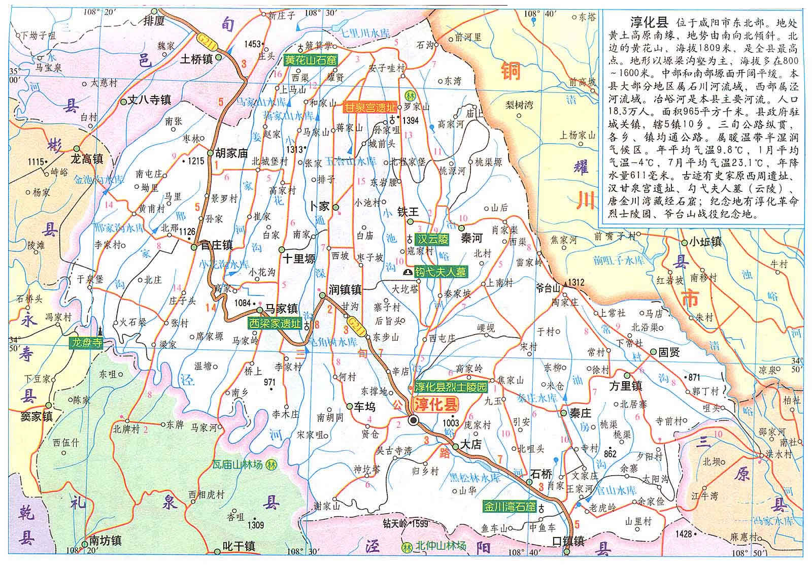 淳化縣以北宋太宗淳化年號(hào)而名。淳化縣位于三秦之腹,涇水之陽(yáng),南接北仲、嵯峨二山,北枕子午嶺余脈甘泉山(今黃花山),東依爺臺(tái)山,西鄰金池水。山圍水繞,盆抱而聚。冶峪蜿蜓貫其腹,涇水滔滔繞西南。是一個(gè)典型的山區(qū)農(nóng)業(yè)縣、革命老區(qū)縣和國(guó)家新一輪扶貧開發(fā)重點(diǎn)縣。全縣總面積983.81平方公里,耕地面積54萬(wàn)畝,轄5鎮(zhèn)10鄉(xiāng)204個(gè)行政村,總?cè)丝?0.54萬(wàn)人,其中農(nóng)業(yè)人口17.53萬(wàn)人。境內(nèi)地勢(shì)北高南低,海拔630—1808.9米,地貌可概括為”一丘一山三溝五塬”。生態(tài)環(huán)境優(yōu)越,林草資源豐富,先后被評(píng)為“陜西省綠化模范縣”和“全國(guó)綠化模范縣”。傳統(tǒng)文化積淀深厚,民俗民風(fēng)淳樸,文物古跡眾多,秦直道、秦林光宮、漢甘泉宮、唐“三階教”石窟遺風(fēng)猶存。革命戰(zhàn)爭(zhēng)時(shí)期是陜甘寧邊區(qū)的南大門,鄧小平、劉志丹、習(xí)仲勛等老一輩無(wú)產(chǎn)階級(jí)革命曾在這里生活、戰(zhàn)斗過,震驚中外的爺臺(tái)山戰(zhàn)役就發(fā)生在這里。