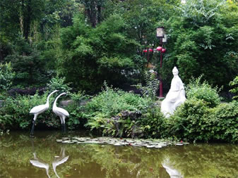 過蓮池旁的“山谷小憩”,亦為園中一景。其間,黃庭堅身著便裝,手拿書卷,在池旁靜坐沉思。兩只白鶴立于水中相伴,此景也稱“雙鶴伴涪翁”,優(yōu)雅清新,寓味深長,形象地表現(xiàn)了黃庭堅在謫居戎州時,平和豁達的心態(tài)。