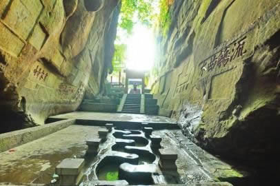仿照東晉書法家王羲之蘭亭集會流觴曲水的意境,黃庭堅利用這峽谷的地形和天然泉水,修建了900多年來遐邇聞名的流杯池。保持其天然的山水景致是文人造園崇尚自然的山水理念,流杯池內,從谷底到崖壁頂,蜿蜒臺階而上,幾個平臺錯落其間,時而寬敞平緩,時而臨崖高懸,這樣的美景是黃庭堅在領會自然美的規(guī)律上進行的藝術再創(chuàng)造。