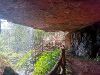 甘泉洞是丹霞地貌中罕見的的大型洞穴,洞長約200米,寬近20米,高約6米。因?yàn)樗且粋常年無水的干的巖洞,當(dāng)?shù)卮迕穹Q為“干巖洞”,洞內(nèi)冬暖夏涼,蚊蟲不生。對洞穴的形成原因,專家認(rèn)為有三個:一是巖石的差異風(fēng)化。在抗風(fēng)化能力強(qiáng)的巨厚的砂巖下,沉積了抗風(fēng)化能力弱的泥巖,泥巖不斷風(fēng)化,洞穴越來越大、越來越寬。二是河水的不斷沖刷。巖洞底部與溪流的河床齊平,年年暴漲的洪水的不斷沖刷,也是洞穴不斷擴(kuò)大。三是附近村民的人為采石。村民采石修路,打掉了洞穴中部分堅(jiān)硬的巖石,擴(kuò)大了洞穴容積。