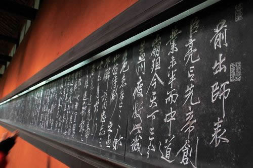 諸葛亮殿的東西廂是書屋、客室,鐘樓、鼓樓峙立大殿二角。諸葛亮殿內(nèi)供祀著諸葛亮的貼金泥塑坐像,左側(cè)是諸葛亮之子諸葛瞻,右側(cè)是諸葛亮的孫子諸葛尚。塑像前有銅鼓三面,鑄于公元六世紀(jì)之前,傳說(shuō)是南征夷蠻時(shí)所用。大殿后壁嵌有許多石刻,東壁是當(dāng)代書法家沈尹默書寫的諸葛亮 《隆中對(duì)》 ,表達(dá)的是“三顧頻繁天下計(jì),兩朝開濟(jì)老臣心”的壯志雄心;西壁則是宋代名將、“精忠報(bào)國(guó)”的民族英雄岳飛所書的諸葛亮 《出師表》 ,“鞠躬盡瘁,死而后已”名句傳誦千古,忠誠(chéng)執(zhí)著的浩然正氣氣貫長(zhǎng)虹。殿內(nèi)外匾對(duì)甚多,都是對(duì)諸葛亮的謳歌和追思。