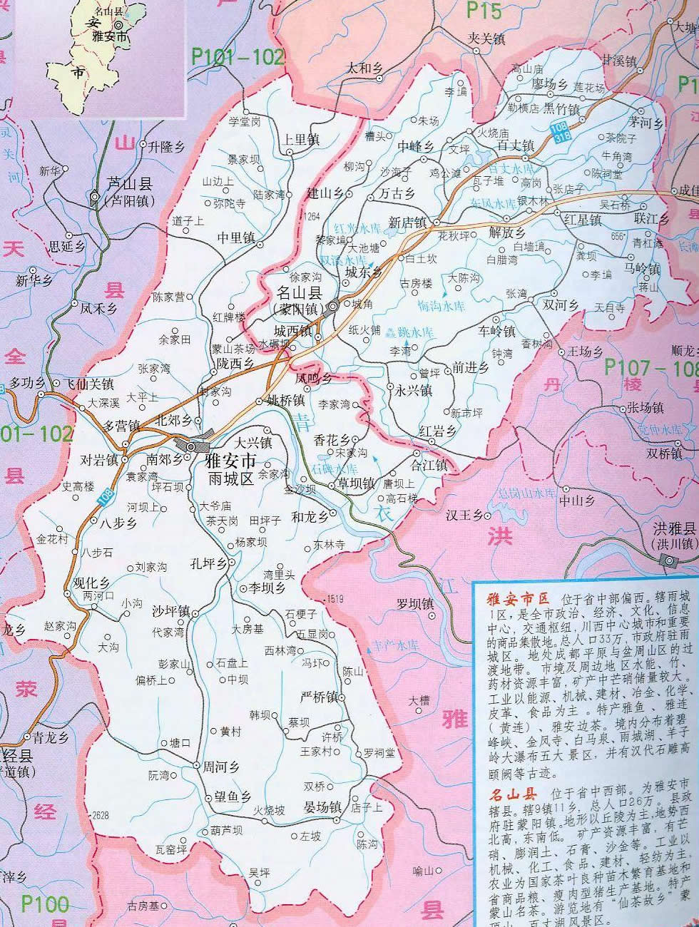 雅安市雨城區(qū)位于四川盆地西緣,青衣江中游,成都平原向青藏高原過渡帶。處于川藏、川滇西公路交匯處。地處東經(jīng)102°51′~103°12′,北緯29°40′~30°14′,東西寬34公里,南北長63公里,地勢呈南北長條形,西南高,東北低。川藏、川云西線、雅(安)樂(山)3條國、省級公路貫穿全境,現(xiàn)成雅高速公路建成開通后距省會成都約120公里。