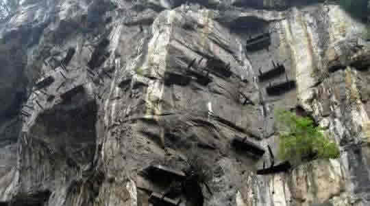 珙縣洛表麻塘壩和蘇麻灣是僰人懸棺最集中的地方,僅在縱深四千米長的麻塘壩懸崖絕壁上,現(xiàn)存上萬個棺樁棺孔;數(shù)百具懸棺,是世界上懸棺分布最集中,保存最完好,數(shù)量最多的地區(qū),被譽(yù)為“世界一絕”、“天然懸棺葬的博物館”。其悠久的歷史,神奇的傳說,神秘的文化,獨特的葬式,耐人尋味,千古難解。同時,隨棺而作的數(shù)百幅巖畫,色彩鮮艷,栩栩如生;形象地再現(xiàn)了僰人時代的自然環(huán)境、社會生產(chǎn)、民風(fēng)民俗、宗教信仰,令人折服。入口處的“九盞燈”,因傳說三根橫木上共放有九盞“長命燈”而得名,它前有點將臺;右有石船。形如斧砍的石灰?guī)r絕壁上,分布了二十四具懸棺、六十二幅巖畫。懸棺神奇絕妙,府瞰萬眾;巖畫題材廣泛,內(nèi)容豐富,牽馬放牧,垂鉤釣魚、舞蹈、球戲、踢鍵娛樂。雖然構(gòu)圖簡練,線條粗獷,卻富有濃郁的生活氣息和鮮明的民族風(fēng)格。而最遠(yuǎn),最高的當(dāng)數(shù)老鷹巖;14具懸棺懸置在110余米的峭壁上,為懸棺精華。而蘇麻灣山勢巍峨;奇巖崢嶸,河水澄澈清瑩,山光水色相映成趣,優(yōu)美迷人,在距水面50余米的懸崖峭壁上重重疊疊的放有50具懸棺,并留有大量樁孔,給人以奇異神秘的感受。另外,麻塘壩謝家灣,留有一民國建筑一何家大院,已有180多年的歷史,占地15畝,全為木質(zhì)結(jié)構(gòu),有三座院落,一個花園,二座石碉樓;雕刻精美,巧妙絕倫。